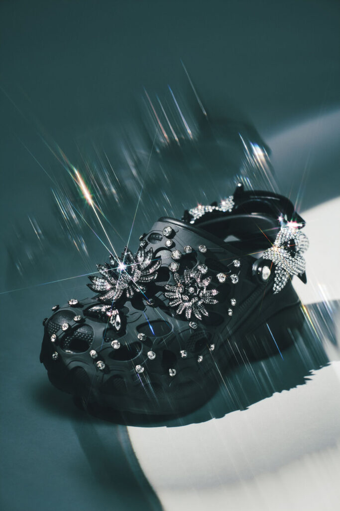 Crocs and Swarovski bring a level of craft to this collection that feels intentional rather than ornamental. Artisans set every crystal by hand, reinforcing the idea that precision and care matter even in the most unexpected places. They don’t disguise the shoes’ origins; instead, they allow form and light to do the storytelling.