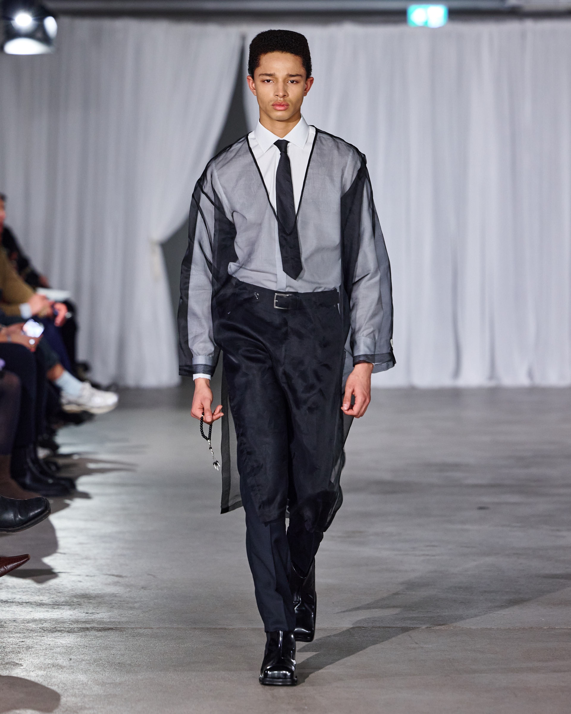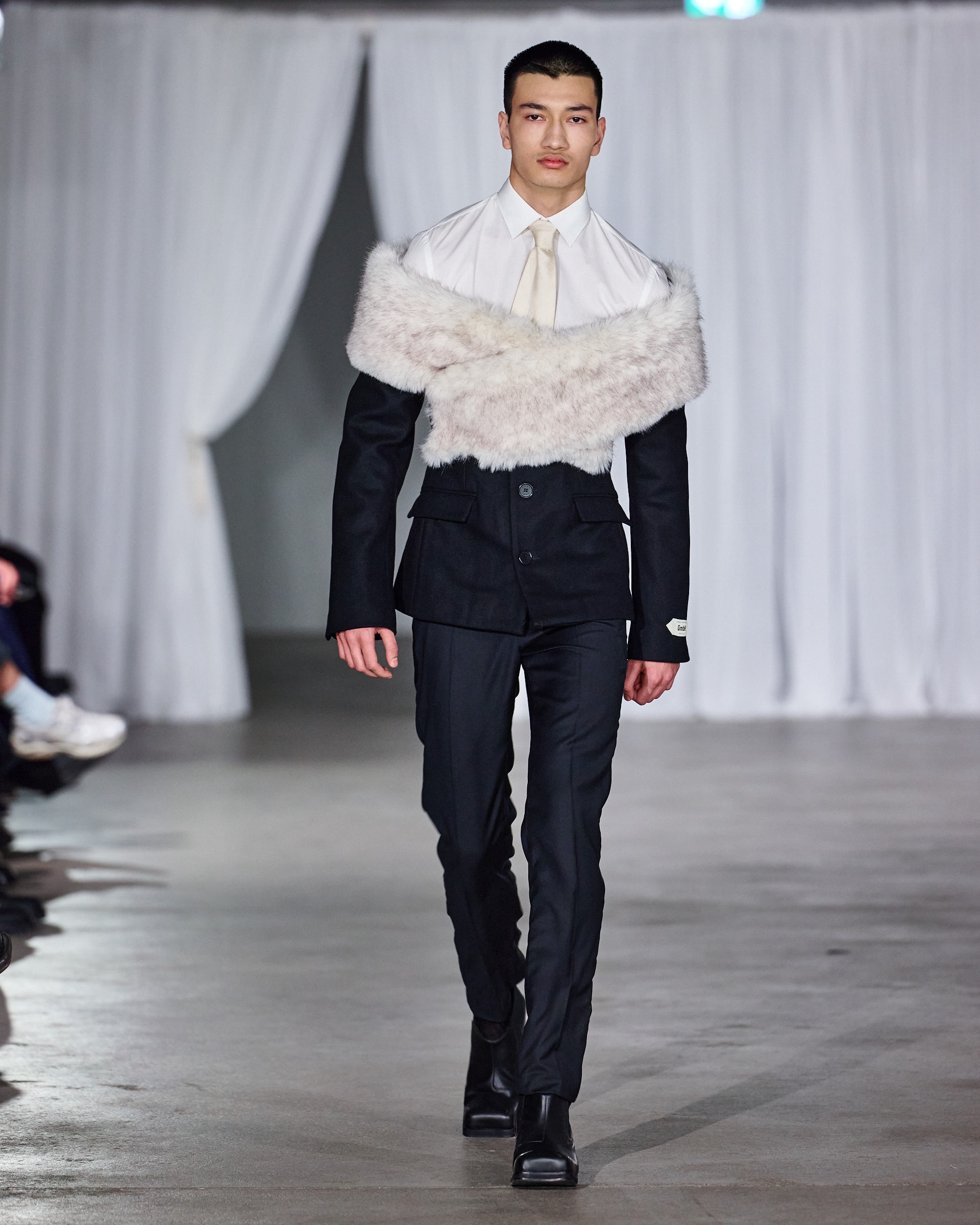 White gazar clouds encircled the neck, while faux fur stoles draped elegantly over shoulders, bringing a melancholic glamour. Robust chunky ankle boots with pronounced square toes grounded the collection in GmbH’s signature futuristic edge.