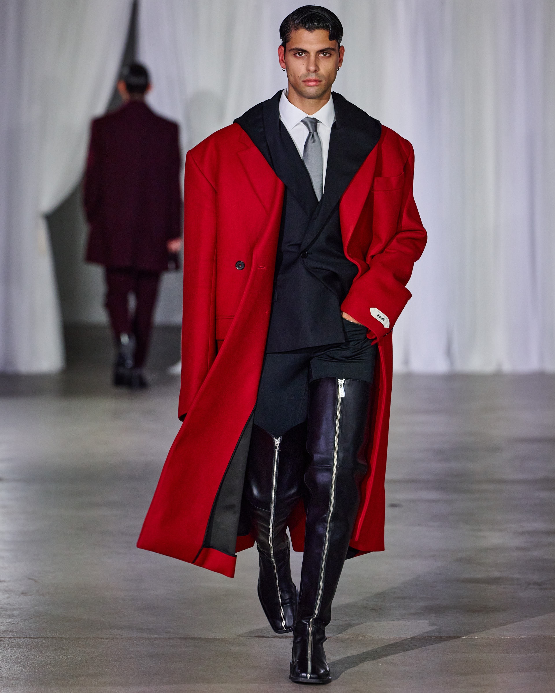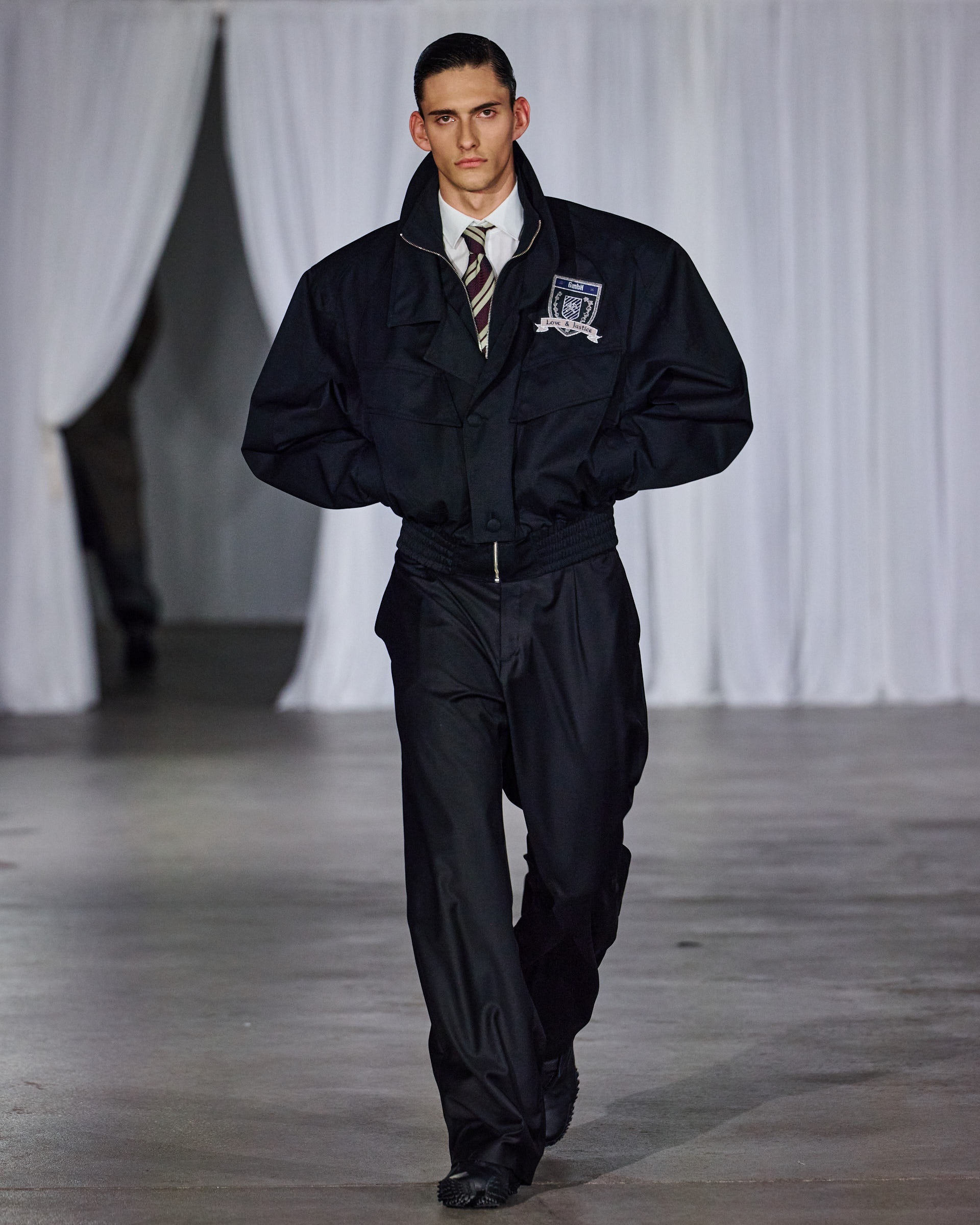 The show featured a series of noir-inspired ensembles with lean tailoring, dramatic draping, and textured layering.