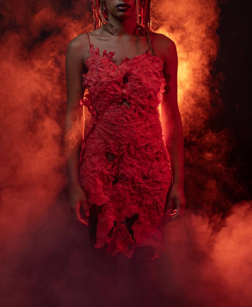 The first debut show in fashion was Aporia, her Bachelor’s Degree, which was a Manifest performance anti-fast fashion, made entirely from upcycled materials. Since then she has continued to make her collections choosing themes around human behaviour. The last collection MaterialME, made from supermarket packages, was exhibited at Studio183 Berlin.