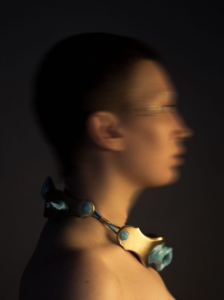 “The inspiration was the suffering and discomfort that accompany wearing this jewelry. The blue forms represent imperfection, which, when combined with the brass fittings, creates beauty.”