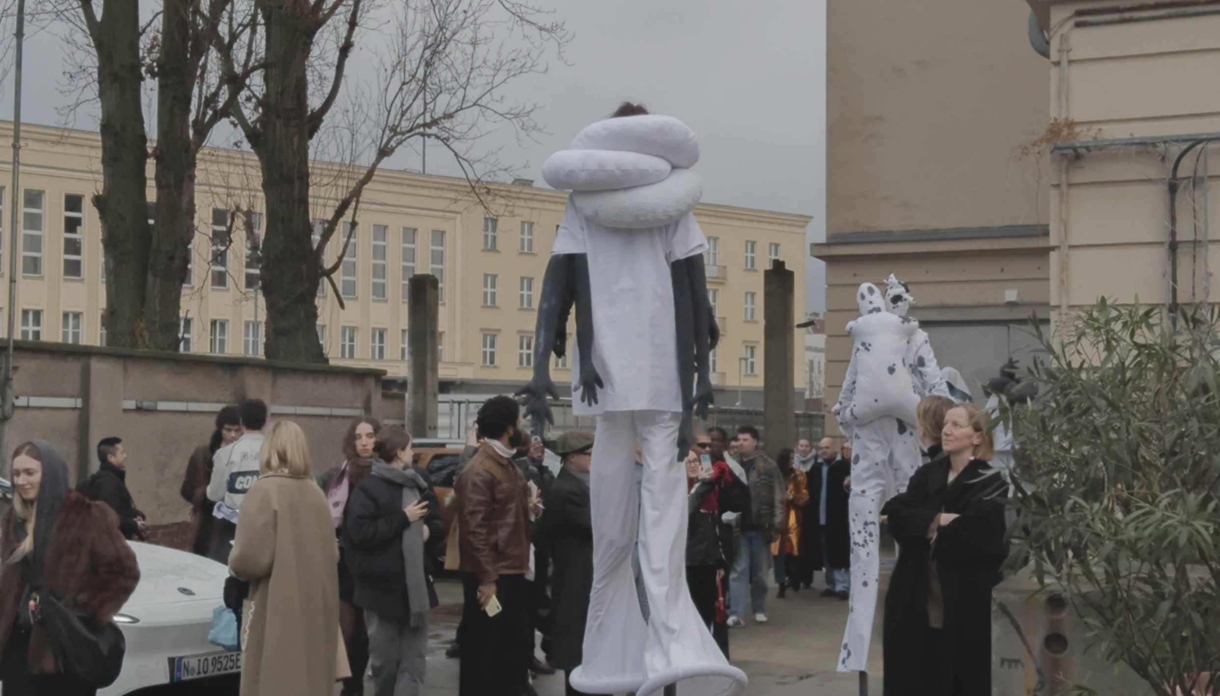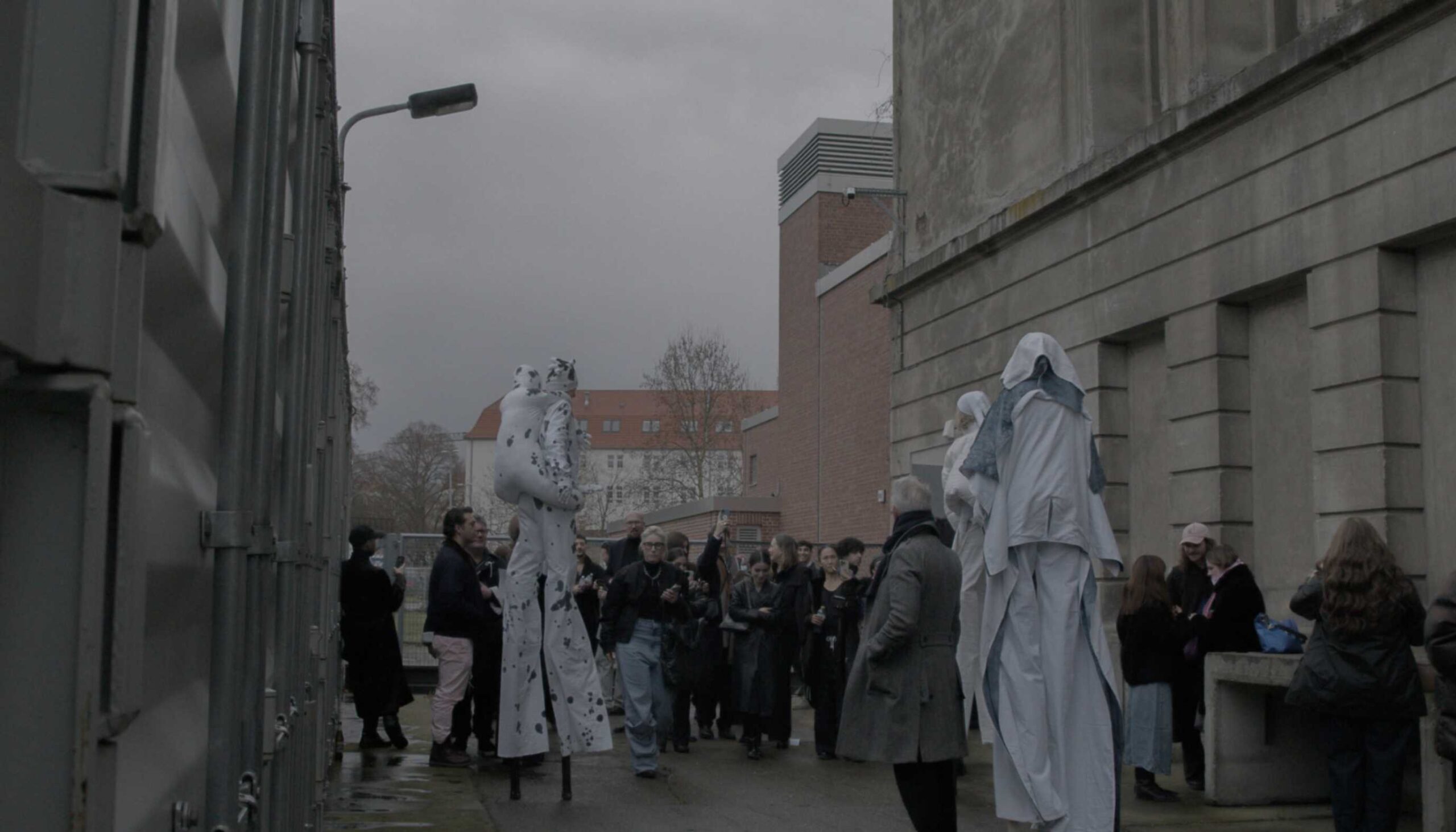 Moving on stilts, the performers welcomed guests of the Berlin Fashion Week 2025 coming outside of a show in the iconic Berghain club, challenging the audience to shift their gaze upwards.