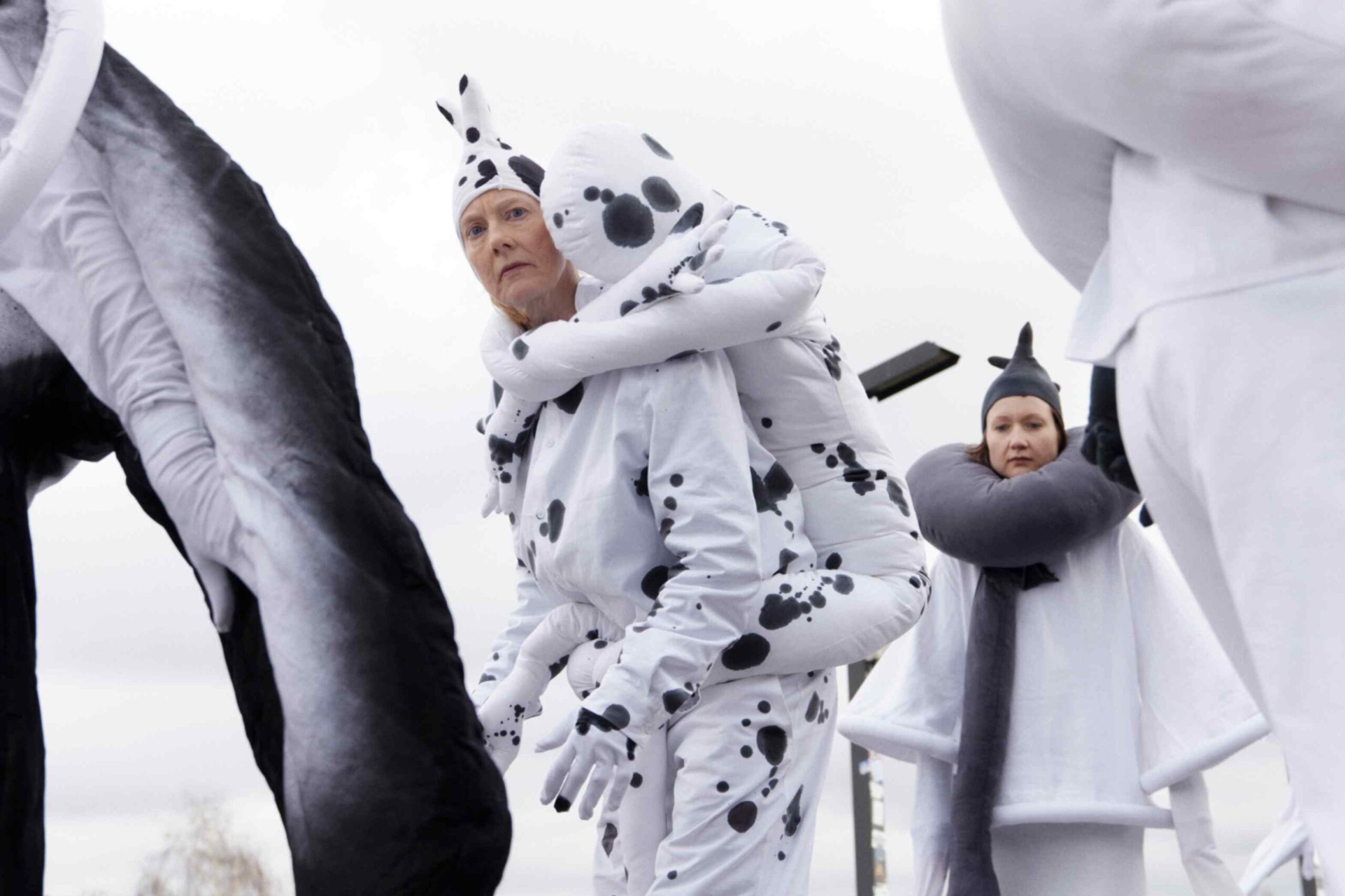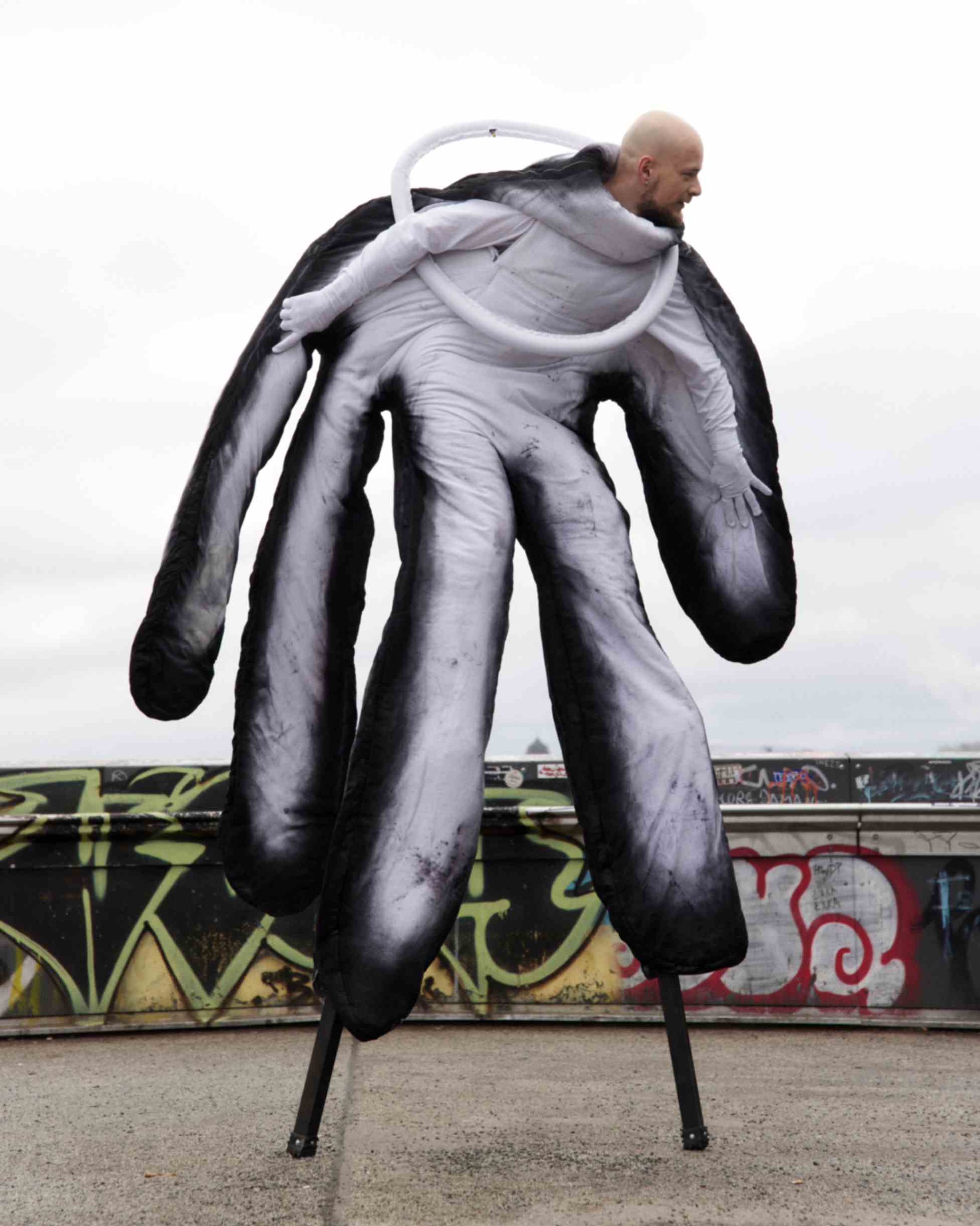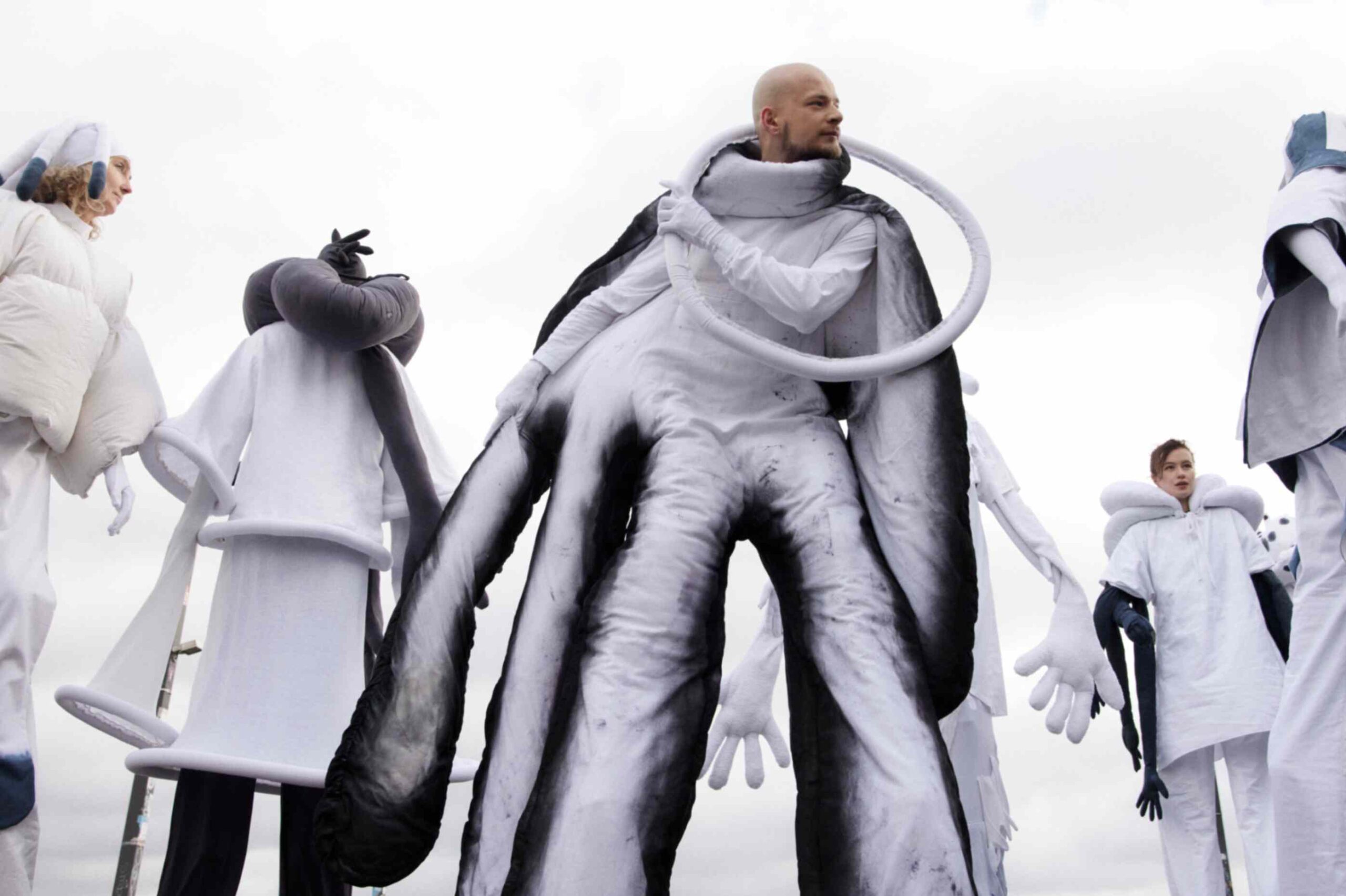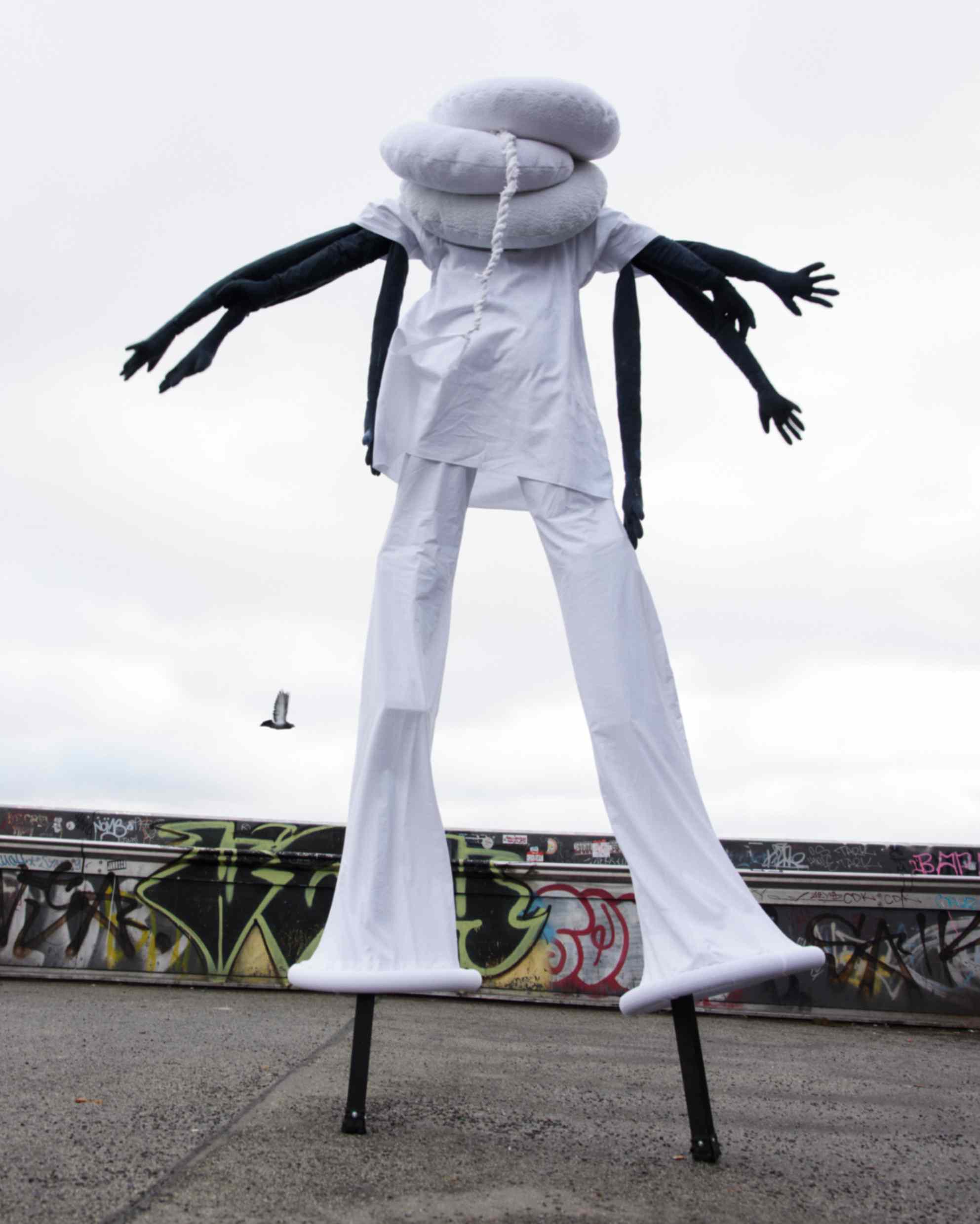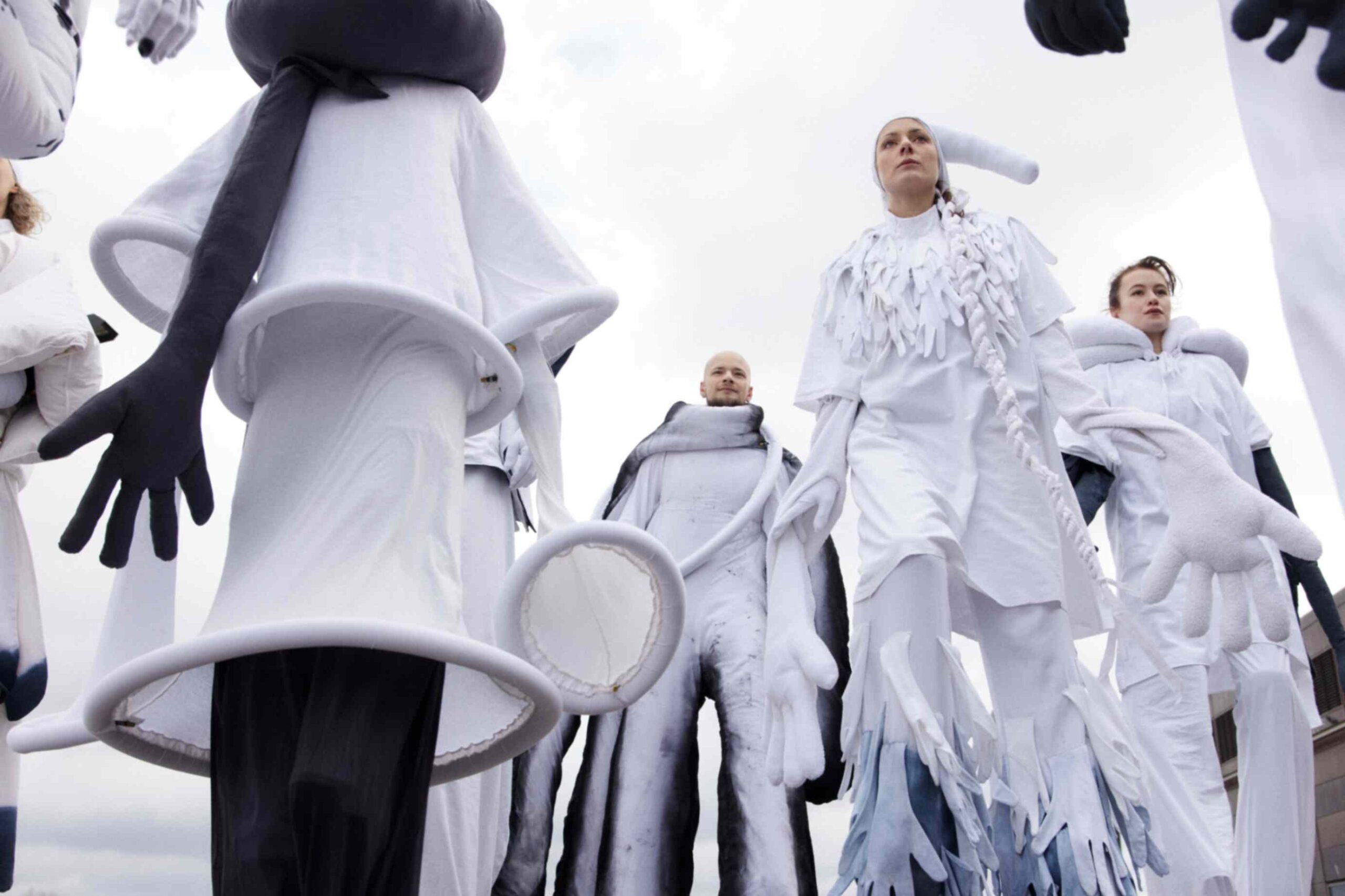 In a world where we are accustomed to meeting each other at eye level, KOPF HOCH! (Look up!) invited the audience to break from routine, to lift their heads, to confront the unexpected. The figures were made from upcycled bed sheets, towels, tablecloths, and linens — discarded materials repurposed into moving sculptures.
