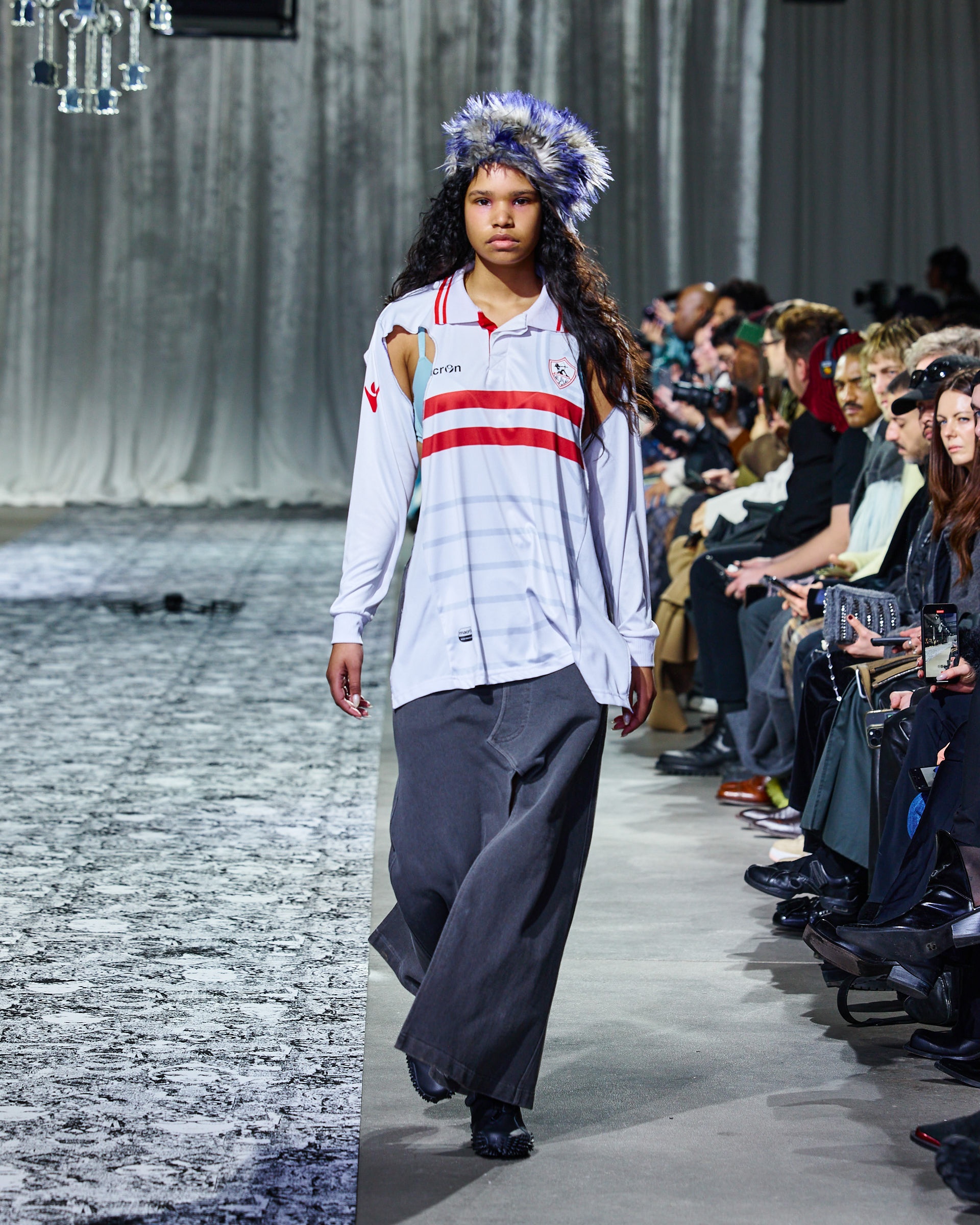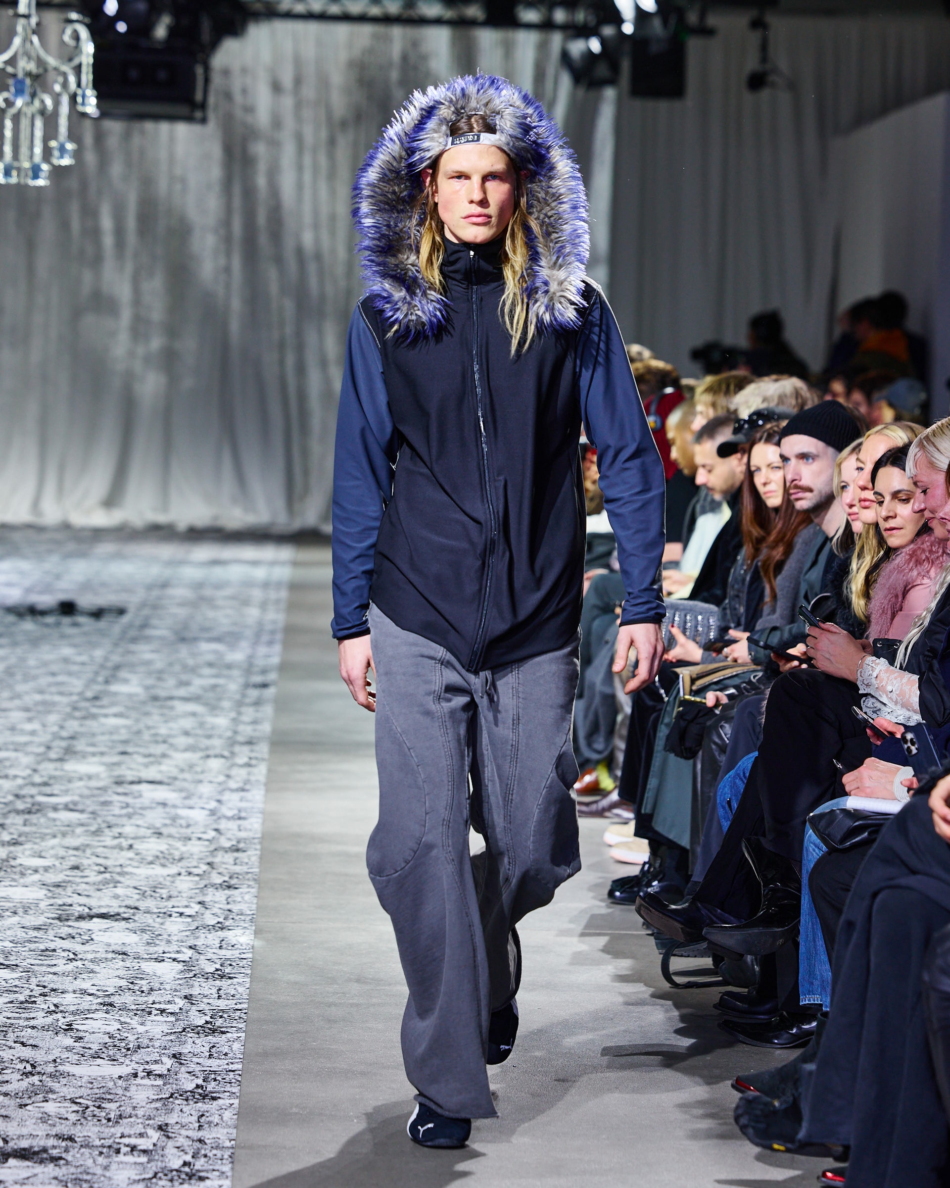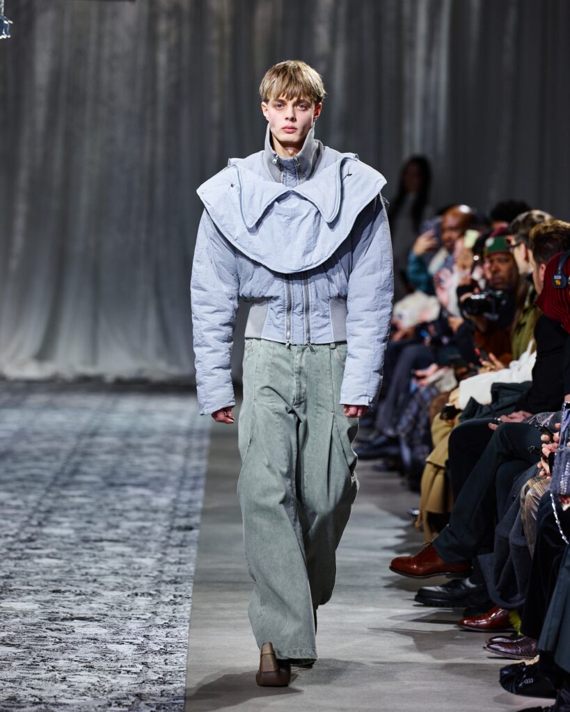 Additionally, the collection showcased hooded sweaters, double-zip jackets with rib-knit inserts, and loose-fit jeans and sweatpants with sculpted seams. Designers elevated the pieces with rich textures, incorporating velvet, bold prints, and innovative shapes. At the same time, the immersive runway design captivated the audience.