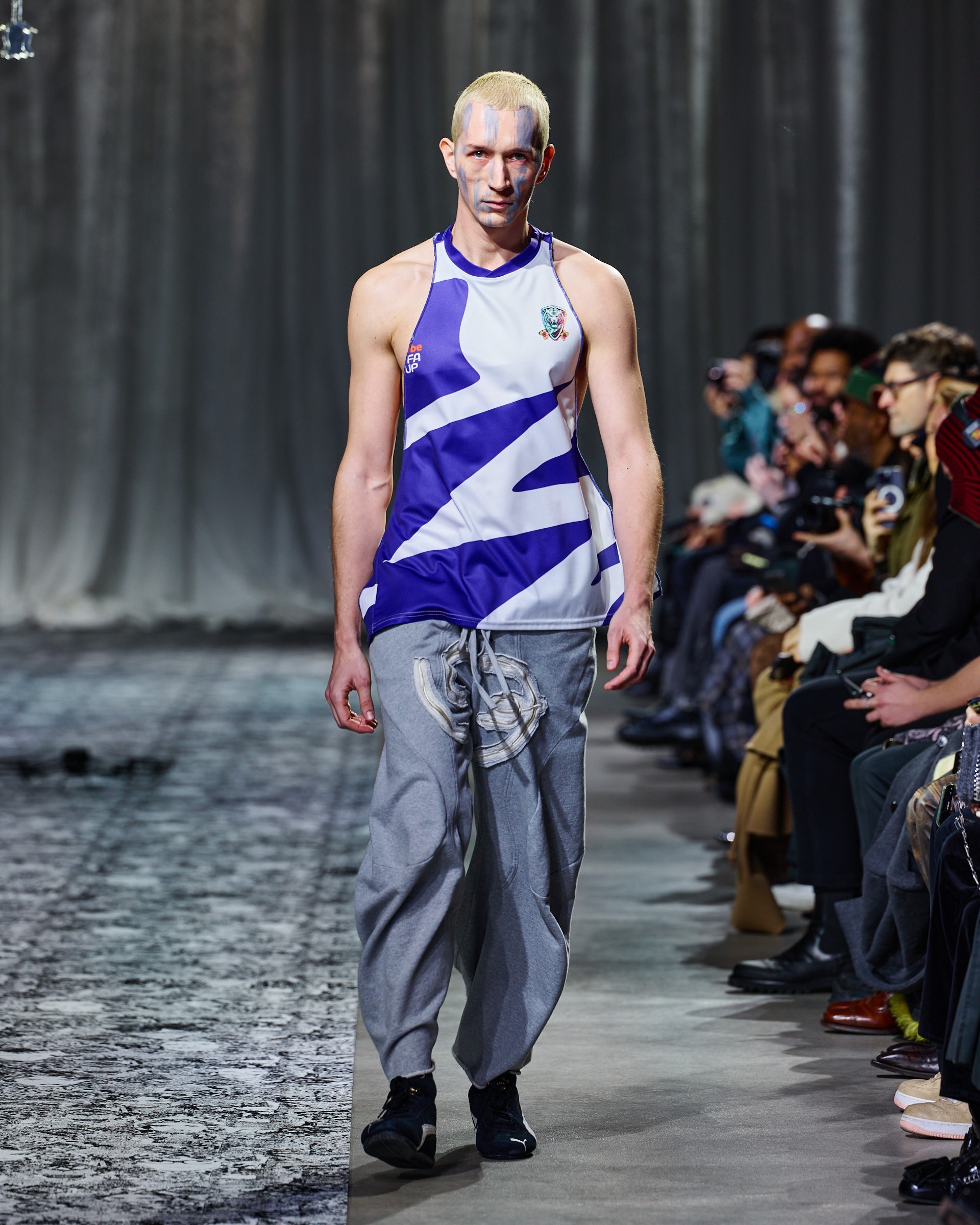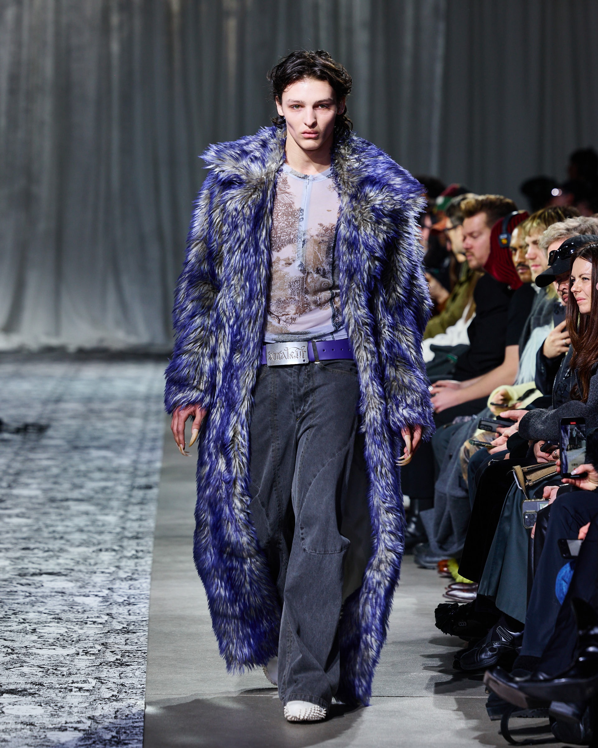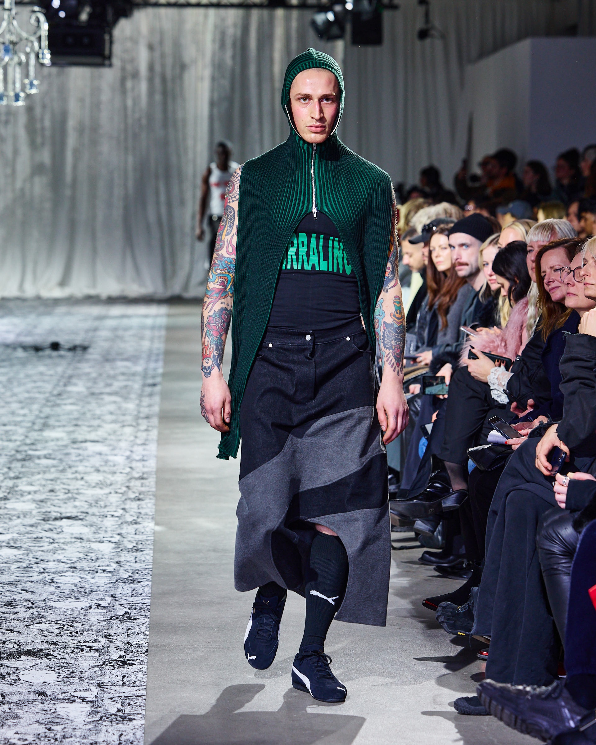Additionally, the collection showcased hooded sweaters, double-zip jackets with rib-knit inserts, and loose-fit jeans and sweatpants with sculpted seams. Designers elevated the pieces with rich textures, incorporating velvet, bold prints, and innovative shapes. At the same time, the immersive runway design captivated the audience.