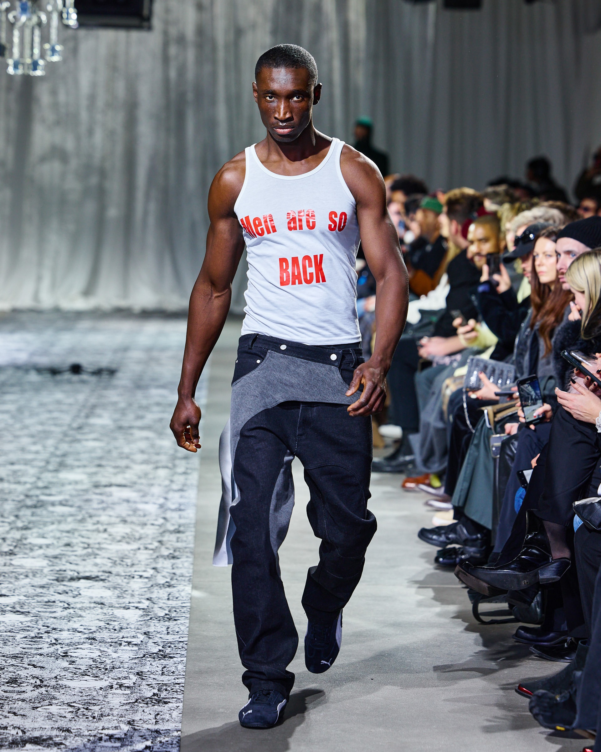 The collection included statement tops boldly featured the Lueder logo with striking phrases like “Men are so BACK,” thus injecting humor and extroversion into the lineup.